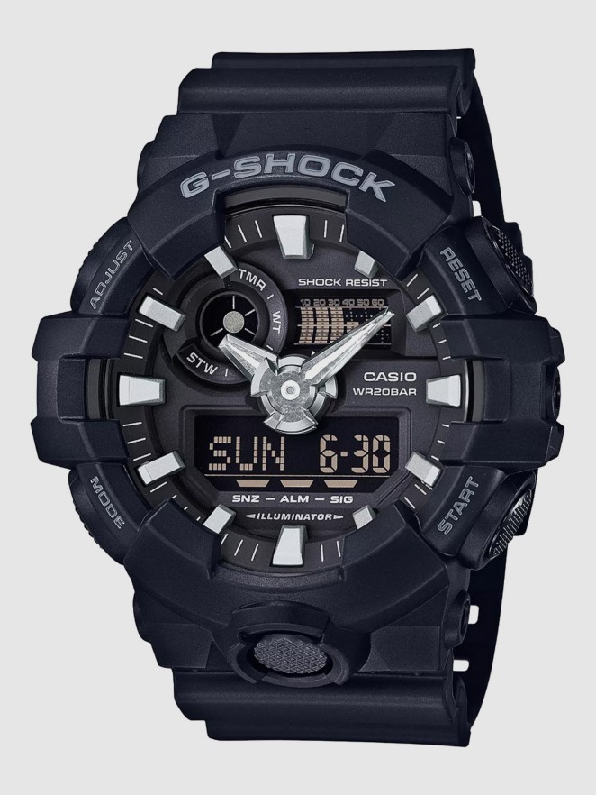 GA-700 analogue/digital combination model features a powerful and bold design with 3D face paired with multi-dimensional hour and minute hands - improving display visibility and evoking a feeling of toughness, the enlarged hands mimic carved out metal with a full silver coating. A front button at 6 o'clock adds to the dynamic, leading-edge styling.