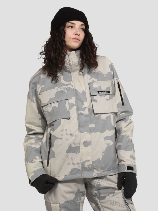 The loose-fitting jacket has lift-pass sleeve pocket, adjustable bottom hem, fleece pocket lining, jacket-pant connectors, inner media pocket with transparent window, snow skirt with non-slip band, elastic inner sleeve cuffs, adjustable sleeve cuffs with velcro closure, chinguard with brushed fleece, front hood adjustment, threads by Coats, YKK zippers, critically taped seams, pocket keychain, ergonomically shaped sleeves and snag free vent with mesh backing.