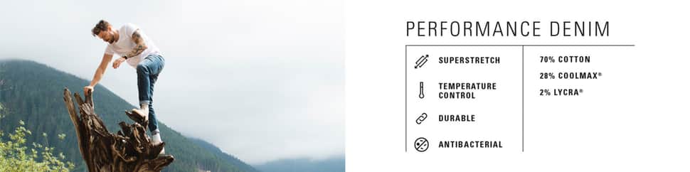 At first glance, Performance Denim looks like a regular jeans, 5 pockets, fashionable cut and indigo wash. But due to its material mix, it is much more elastic and supple than normal jeans. Coolmax® is part of the jeans which makes the pants breathable and antibacterial. These properties make the Performance Denim Jeans ideal for people who do not want to miss out on the look of jeans despite an active lifestyle.